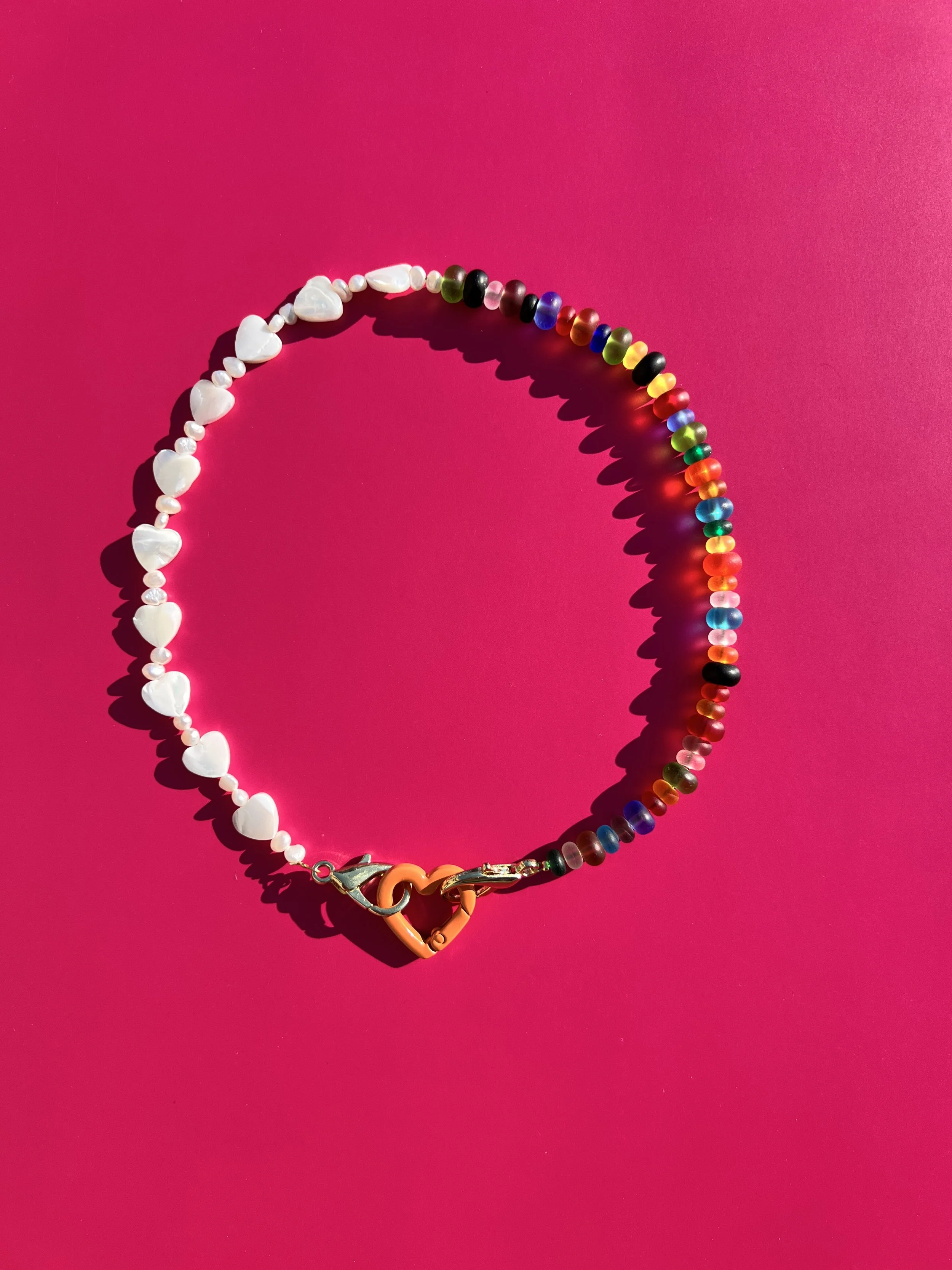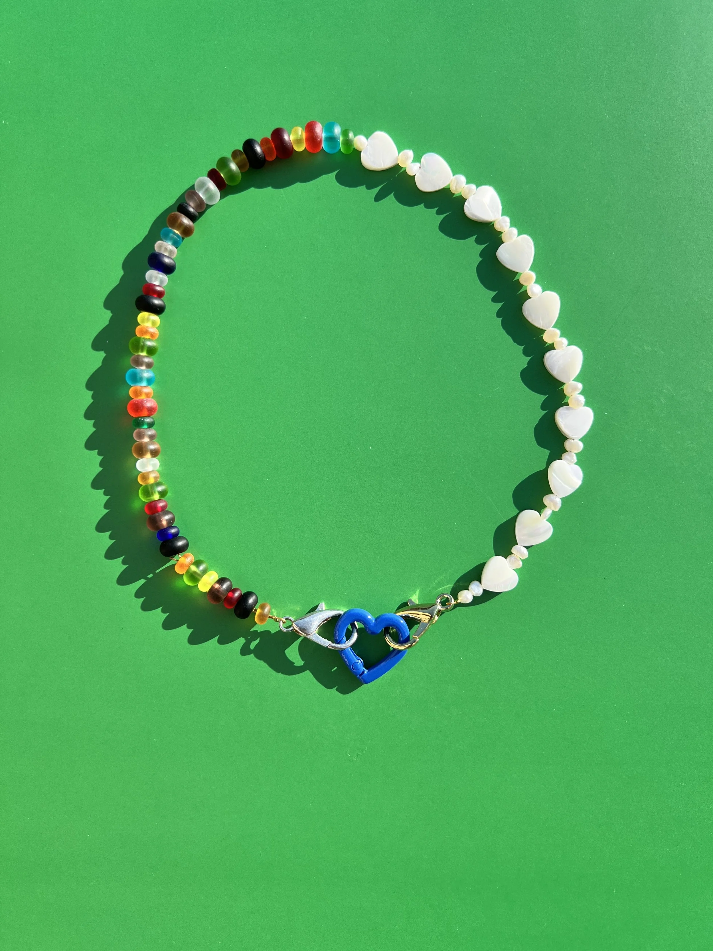 Necklaces made with colorful glass beads and assorted colorful carabiners. Necklaces can be unclasped in multiple areas - recommended to use one of the large lobster claw clasps.